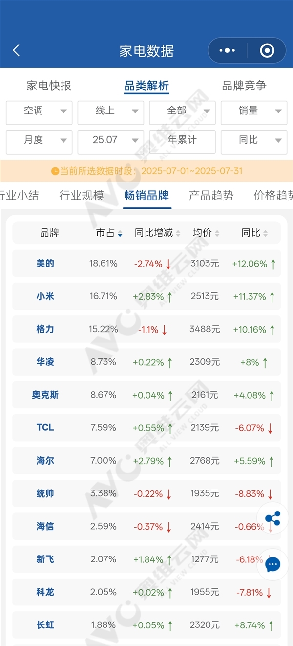 快科技8月16日消息,奥维云网数据显示,7月份(7月1日-7月31日)小米空调线上销量超越格力,前者市占率16.71%,后者市占率15.22%。