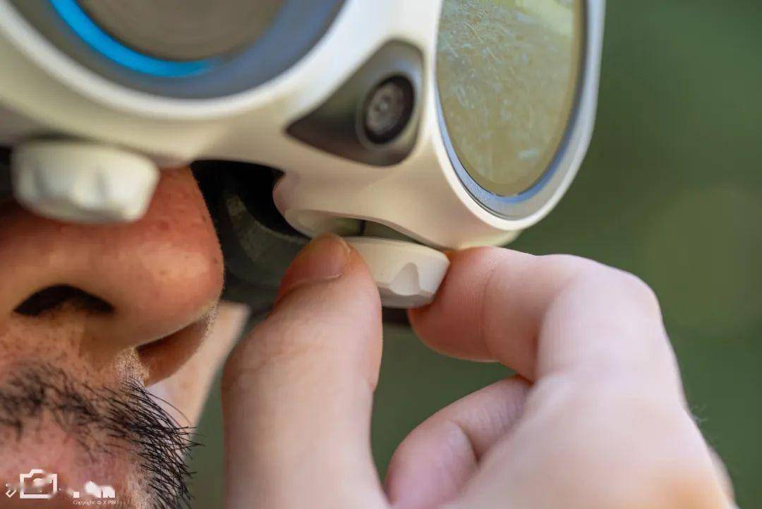 另外别看这眼镜不算大,但它不仅里面能看风景,外面还有一块显示实时飞行画面的圆形屏幕,这样当你专注飞行的时候,和你一块出来玩的朋友也不至于原地刷手机,可以一起围观看看实时的风景。