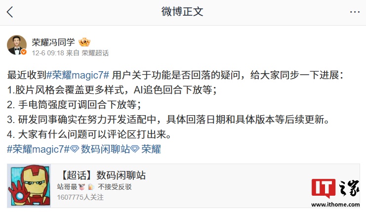 IT之家 12 月 7 日消息,荣耀游戏研发工程师 @荣耀冯同学 昨日发文回应了用户关于 Magic7 系列机型功能回落的进展: