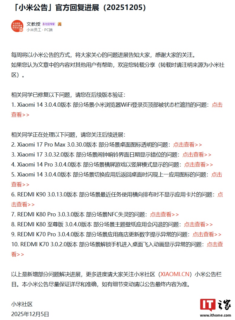 IT之家 12 月 7 日消息,小米员工本周在小米社区更新澎湃 HyperOS 最新优化进展,其中提到用户所反馈的 Xiaomi 14 在 3.0.4.0 版本部分场景小米浏览器 WiFi 登录页顶部被状态栏遮挡的问题已优化,可在后续版本验证。此外,小米官方还定位到了 Xiaomi 17 系列部分机型的相关问题。