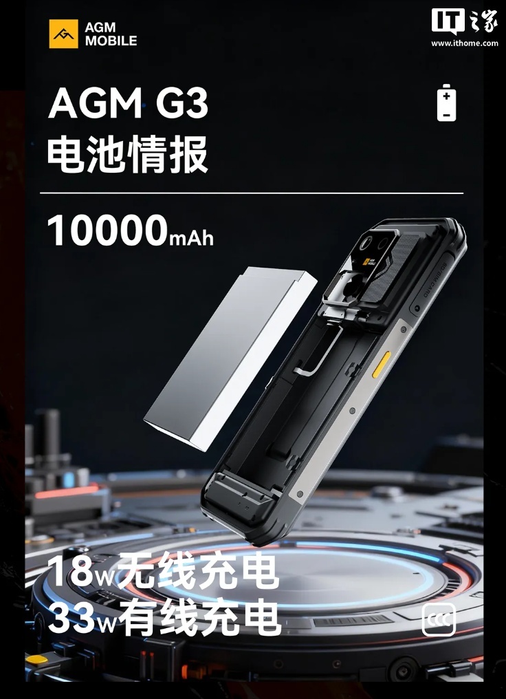 值得一提的是,AGM 手机官方在今年 10 月 18 日宣布将推出 AGM G3。官方表示,新机在提升电池容量的同时,控制了整机重量,通过立体堆叠工艺避免机身过度厚重(具体数据未公布),配合电池纤维吸附技术,实现零漏液、低析锂,解决了大电池长期使用鼓包风险。