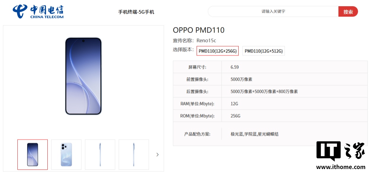 IT之家注意到,OPPO Reno 15c 手机已现身中国电信终端产品库,提供 12GB+256GB、12GB+512GB 两种存储规格,拥有极光蓝、学院蓝、星光蝴蝶结三种配色,产品零售价格尚未公布。