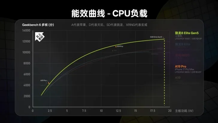 该媒体援引极客湾的评测数据,指出高通第五代骁龙 8 至尊版芯片存在功耗过高情况,其整板功耗高达 19.5W,远超苹果 A19 Pro 同等测试下的 12.1W。