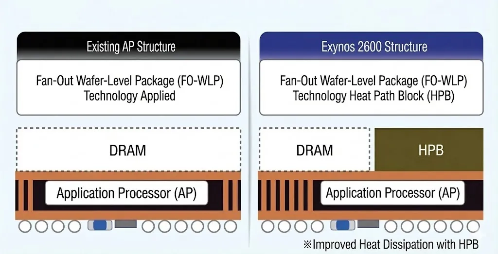 IT之家援引博文介绍,该技术将会在 Exynos 2600 芯片上首发,与以往将 DRAM 内存直接堆叠在芯片顶部的设计不同,三星工程师将 DRAM 移至芯片侧面,并在应用处理器(AP)顶部直接封装了一个铜基 HPB 散热器。