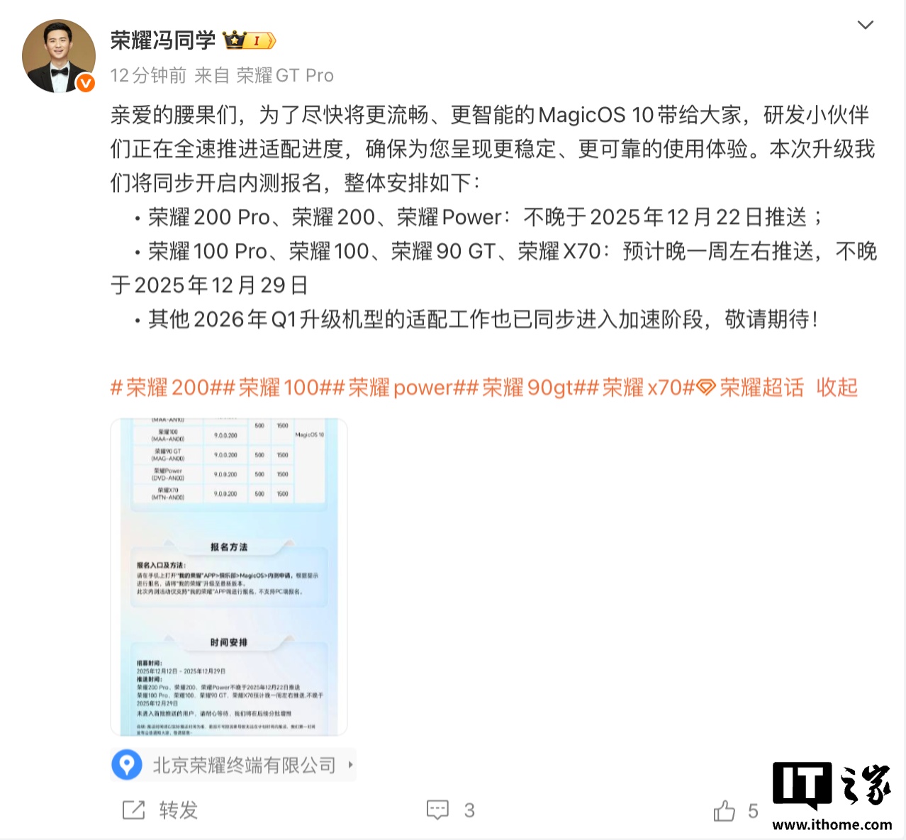 IT之家 12 月 12 日消息,荣耀MagicOS 10 系统第六批内测招募现已正式启动,覆盖机型包括荣耀 200 Pro、荣耀 200、荣耀 Power、荣耀 100 Pro、荣耀 100、荣耀 90 GT、荣耀 X70。