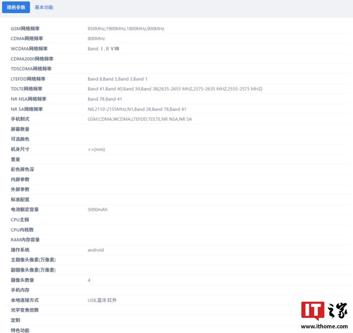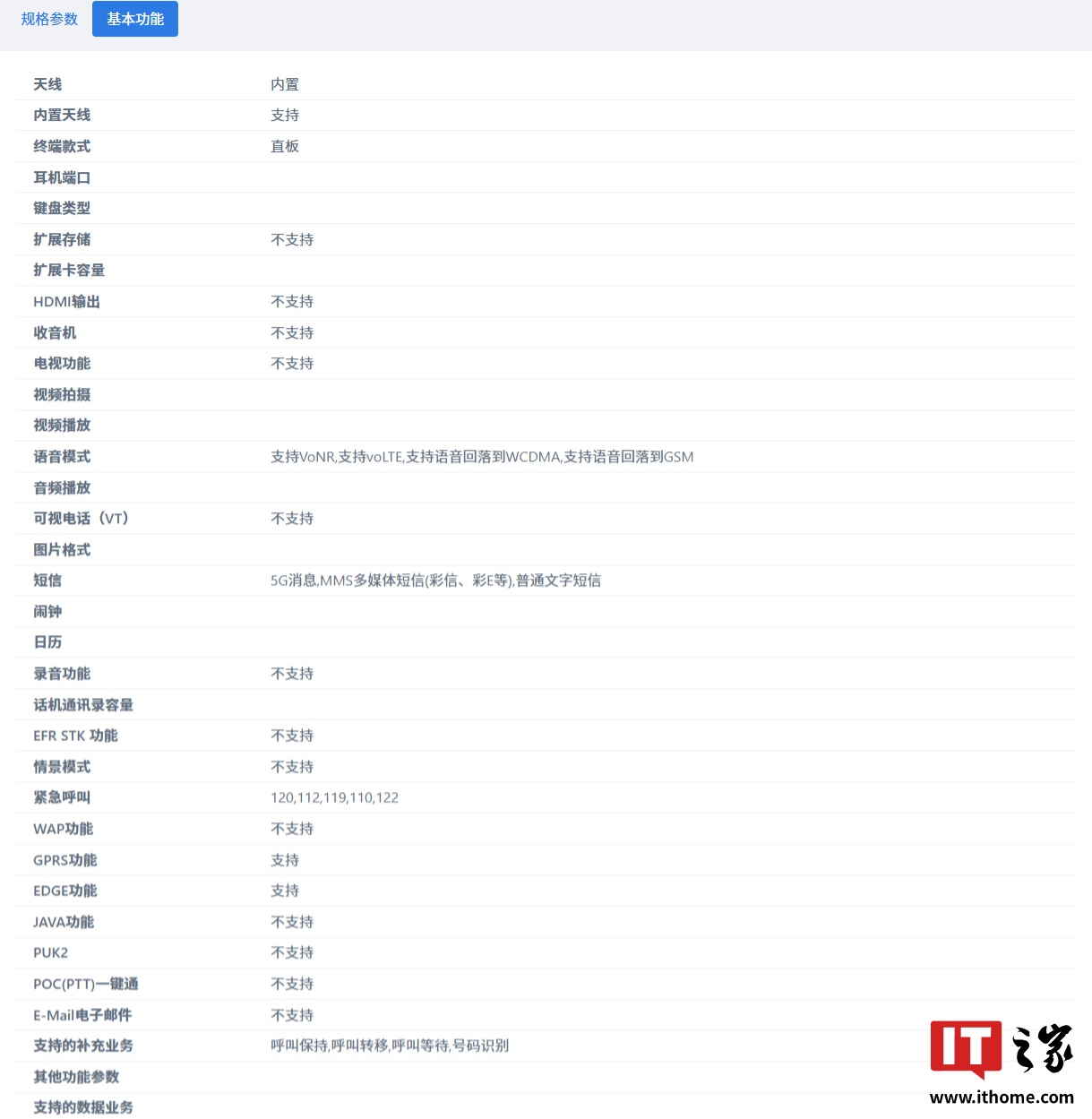 相关页面显示,新机支持 NR SA / NR NSA / TD-LTE / LTE FDD / WCDMA / CDMA 1X / GSM 制式、5G-增强移动宽带(eMBB)技术、5G 异网漫游功能等。