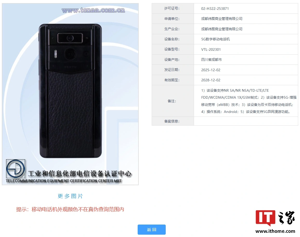 IT之家 12 月 14 日消息,型号为 VTL-202301 的 Vertu 纬图新机已通过电信设备进网许可,并公布了证件照。从图片来看,新机采用皮质拼接机身 + 红色按键设计。
