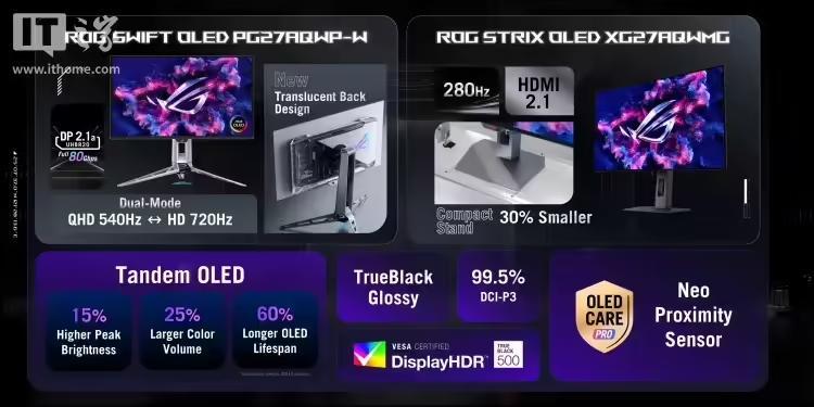 据IT之家了解,ROG Swift OLED PG27AQWP-W 配备了一块 26.5 英寸的 2560 x 1440 QHD OLED 屏幕,支持高达 540Hz 的刷新率。更令人惊叹的是,这款显示器还具备双模式功能,当用户将分辨率调整至 1080p 时,其刷新率可飙升至 720Hz。