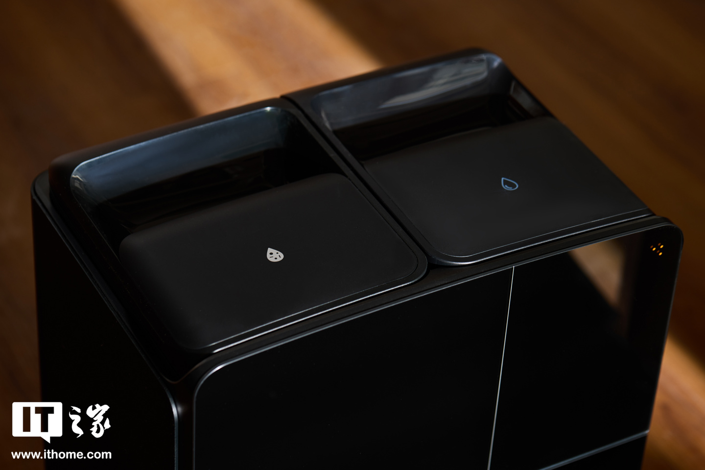 基站下半部分,是尘盒盖,内隐藏了一次性尘袋和抗菌清洁液盒,其中,尘袋容量为 2.5L ,一般家庭 1 年只需换 6 次尘袋,采用 E12 级过滤材质,支持全链路抑菌。