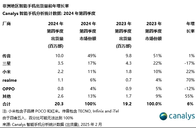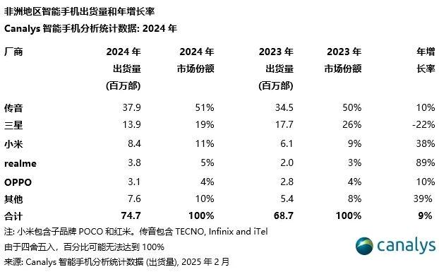 文章来源于互联网:Canalys:2024 年非洲智能手机市场增长 9%,传音稳居第一