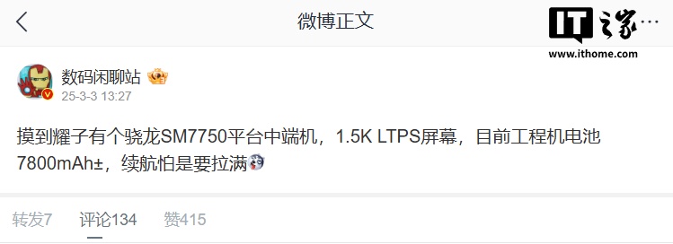 IT之家 3 月 3 日消息,@数码闲聊站 今日爆料称,荣耀旗下目前正在开发一款基于高通骁龙 SM7750(可能命名为骁龙 7 Gen4)平台的中端机型(他在评论区澄清并非荣耀 400 系列)。