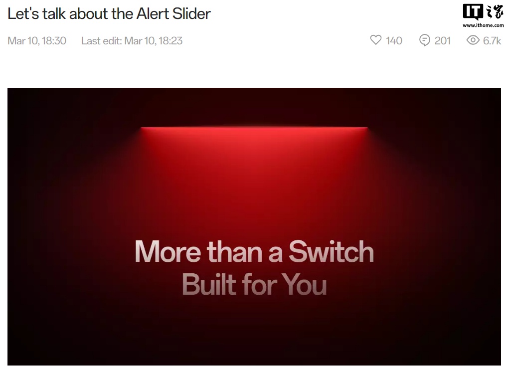 IT之家 3 月 11 日消息,一加创始人刘作虎 3 月 10 日在一加海外社区发文,Alert Slider(三段式滑动按钮开关)作为一加手机的一项经典设计,一直是他的最爱之一,甚至他也将该设计带到了 OPPO 设备上。