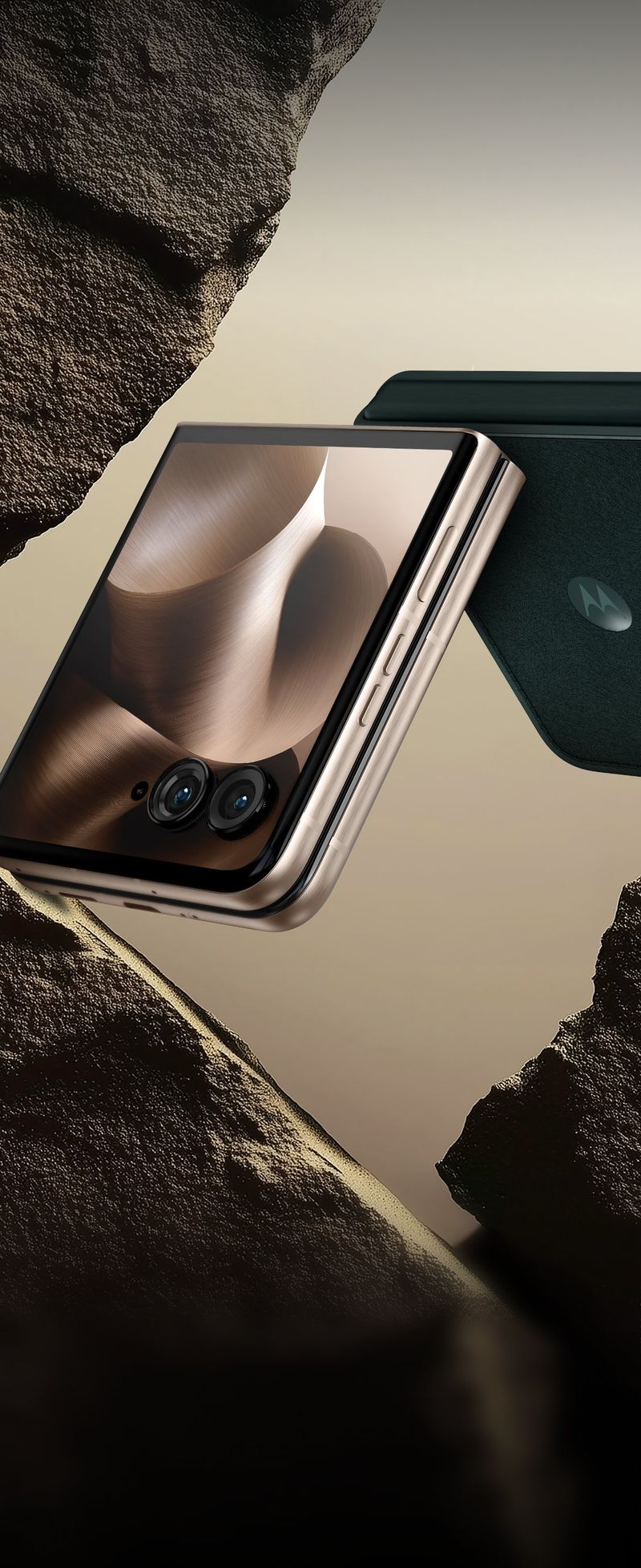 本次曝光的渲染图包含手机铰链特写、不同角度设计展示及生活化场景。根据图片信息,这款折叠屏旗舰在美国市场或命名为 Razr+ 2025,目前已曝光深绿(Dark Green)、里约红(Rio Red)、粉色(Hot Pink)三款标准配色,另有一款采用特殊木质纹理背板的版本,但材质真实性尚未确认。