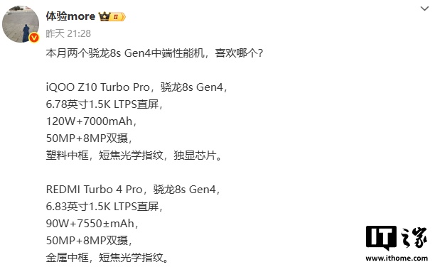 IT之家 4 月 5 日消息,博主 @体验more 昨日曝光了本月两个骁龙 8s Gen4 中端性能机的主要规格,分别为 iQOO Z10 Turbo Pro、REDMI Turbo 4 Pro。