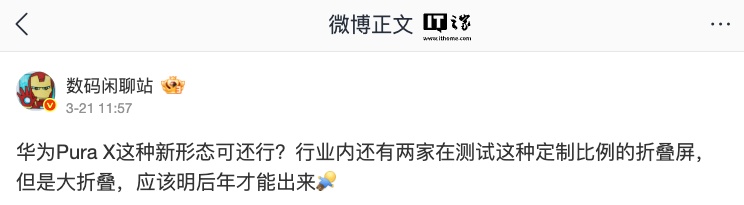 IT之家注意到,博主 @数码闲聊站 上月(3 月 21 日)发文爆料:“行业内还有两家在测试这种定制比例的折叠屏,但是大折叠,应该明后年才能出来。”