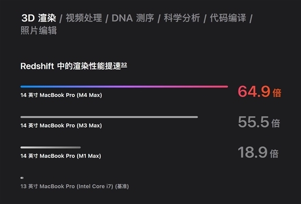对比上代M3 Max,M4 Max在Redshift中的渲染性能提速64.9倍,性能极为强悍。