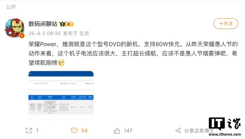不久前,博主 @数码闲聊站信息爆料,荣耀 Power,应该就是入网型号“DVD”,最大充电功率 80W。