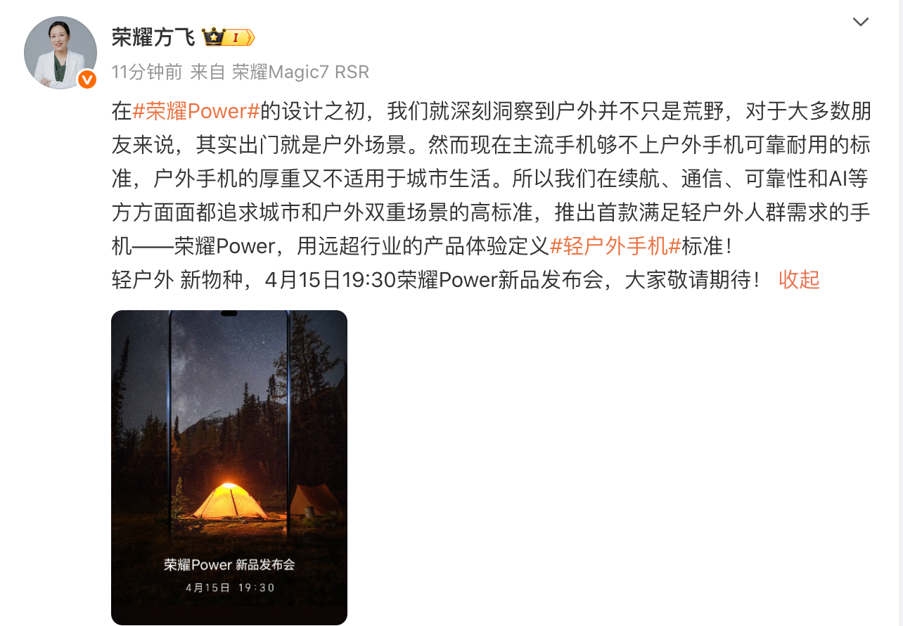 官宣后,荣耀领导人 @荣耀方飞也发微博进一步透露了新机将针对大众用户的户外需求,在续航、通信、可靠性和 AI 等技术亮点方面有新的追求,通过城市精致感与户外专业性的融合设计,会用远超行业的产品体验定义轻户外手机标准。