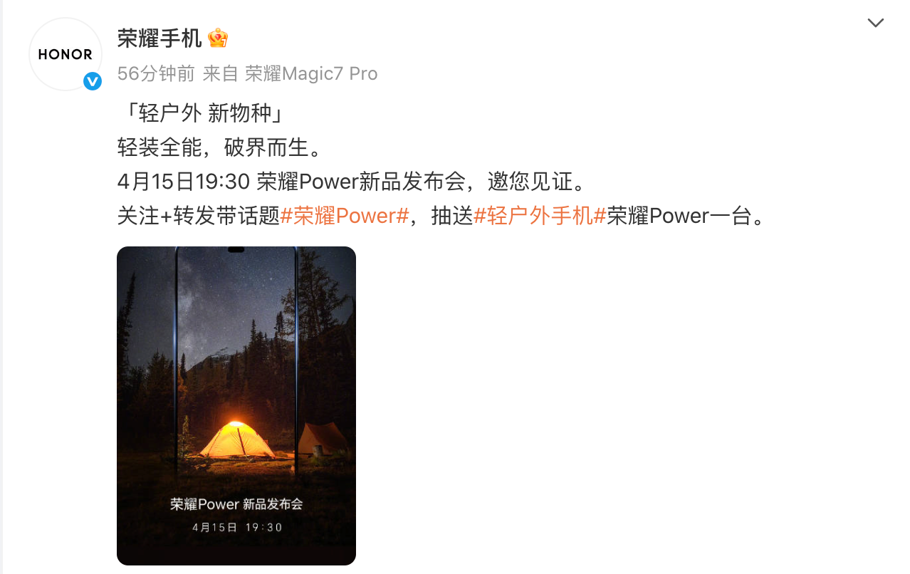 今日,荣耀正式官宣即将在 4 月 15 日推出轻户外新物种荣耀 Power 手机,阿尔法战略发布后的新系列手机。