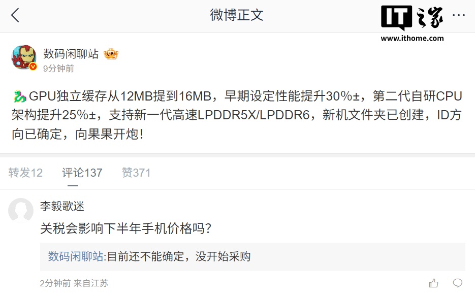 IT之家 4 月 7 日消息,据博主 @数码闲聊站 今日爆料,高通骁龙新品的 GPU 独立缓存从 12MB 提到 16MB,早期设定性能提升 30%±,第二代自研 CPU 架构提升 25%±,支持新一代高速 LPDDR5X / LPDDR6