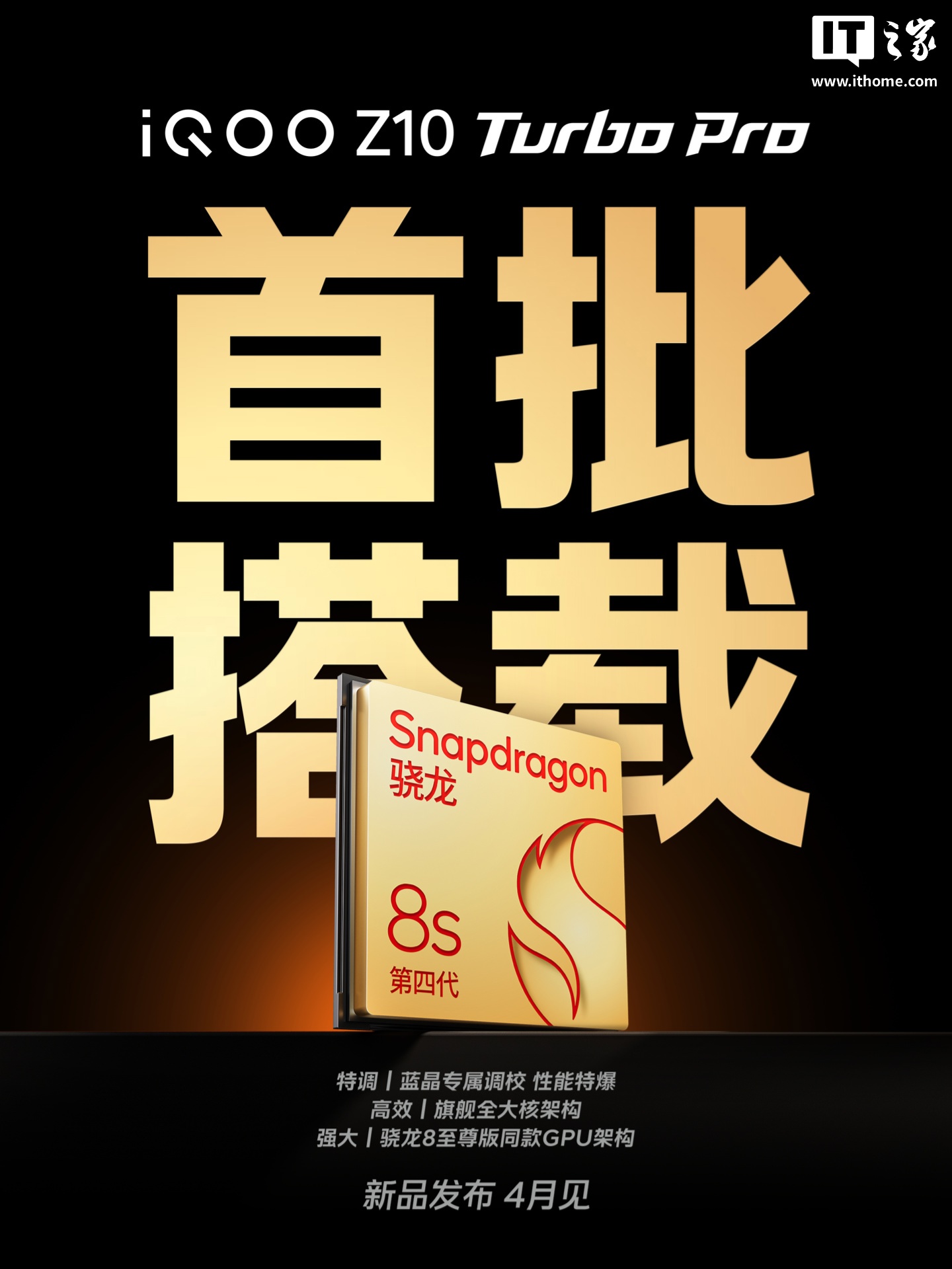 另外,根据 iQOO 官方此前预热,Z10 Turbo Pro 手机将首批搭载第四代骁龙 8s 处理器,并拥有蓝晶专属调校。
