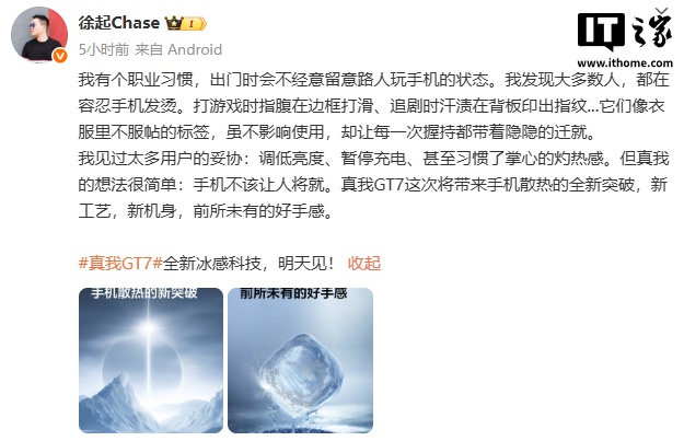 IT之家 4 月 7 日消息,realme 真我副总裁徐起今日发文称,真我 GT7 手机“全新冰感科技”明天见。真我 GT7 这次将带来手机散热的全新突破,新工艺,新机身,前所未有的好手感。
