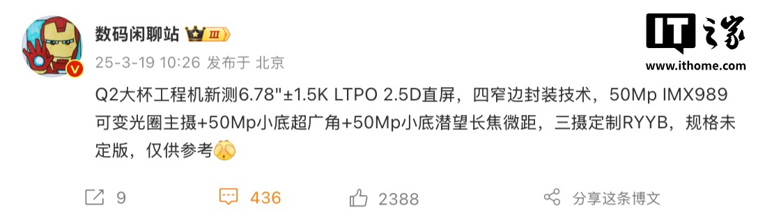 在摄像头方面,该机将搭载 50Mp IMX989 可变光圈主摄 + 50Mp 小底超广角 + 50Mp 小底潜望长焦微距,三摄均为定制 RYYB。不过相应手机规格尚未定版,并不能代表最终实机情况。