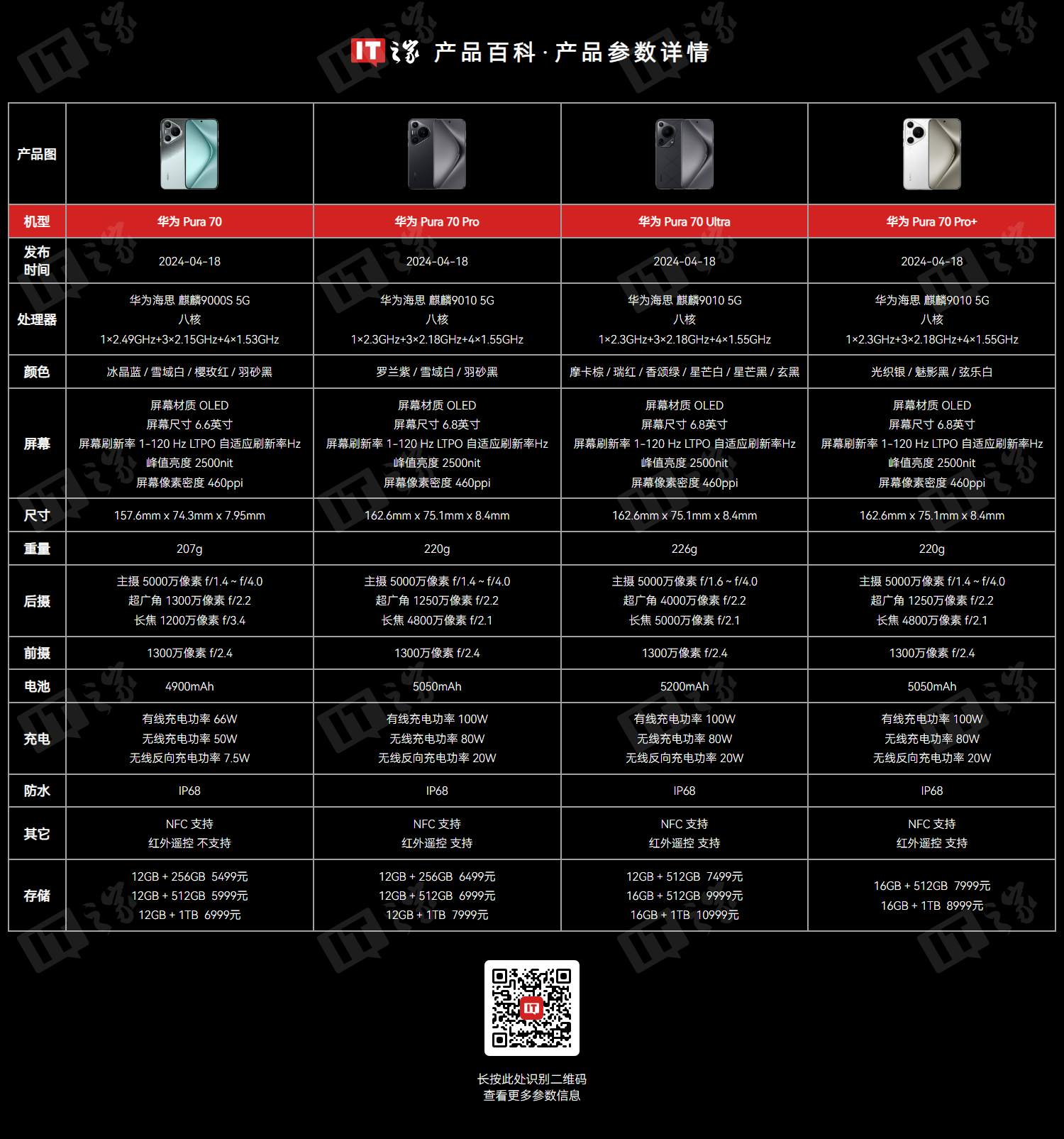 IT之家附华为现款 Pura 70 系列手机规格如下:
