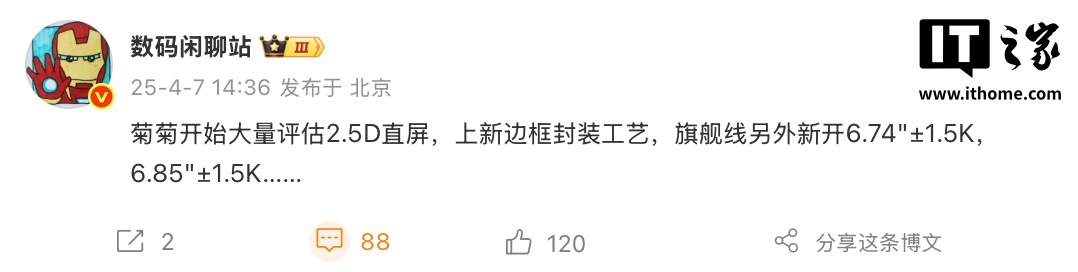 IT之家 4 月 7 日消息,博主 @数码闲聊站 发文,透露华为开始大量评估 2.5D 直屏,引入全新边框封装工艺,在旗舰产品线另外新开 6.74 英寸 1.5K 分辨率面板及 6.85 英寸 1.5K 面板。