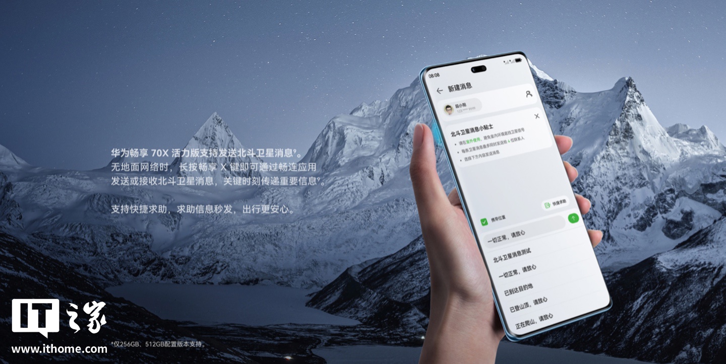 此外,该机(256/512GB 版本)支持北斗卫星消息、北斗卫星图片消息,配备畅享 X 键可一键发送北斗消息。
