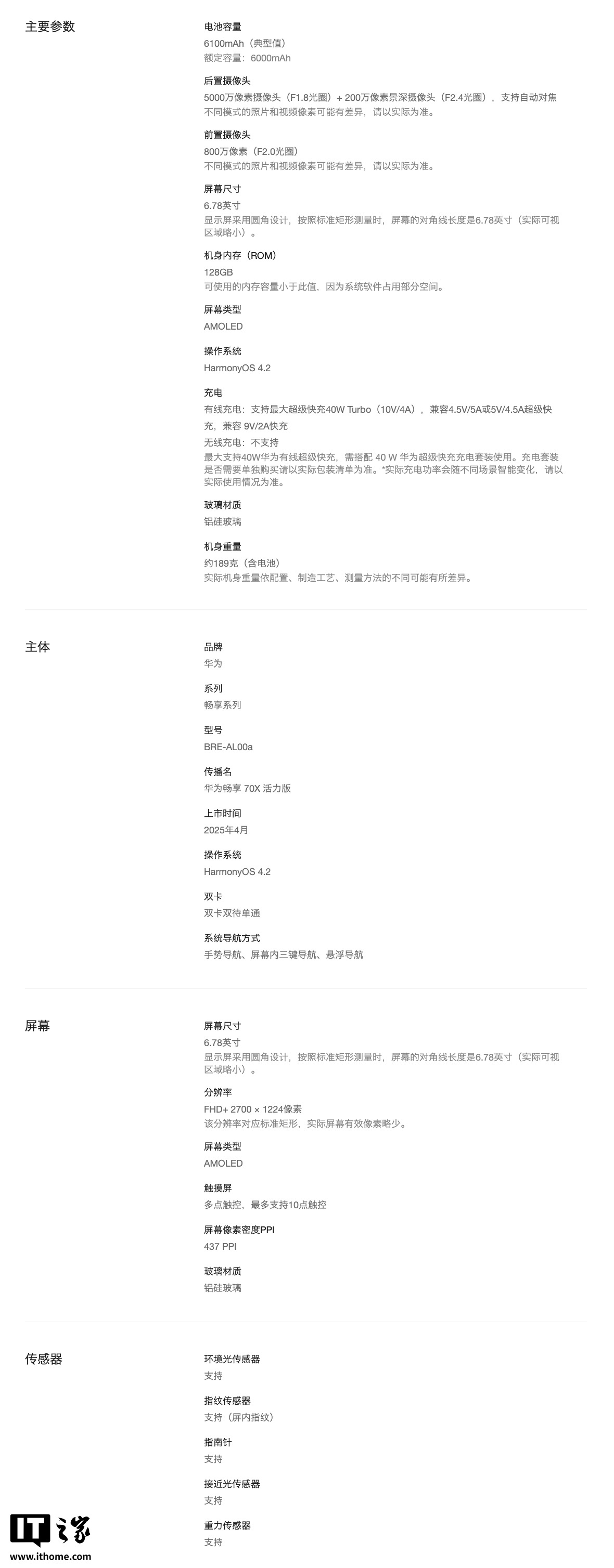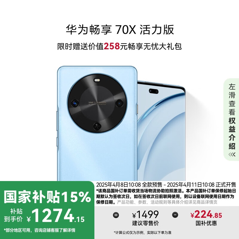 IT之家 4 月 8 日消息,华为畅享 70X 手机“活力版”机型现已开售,IT之家整理具体价格如下: