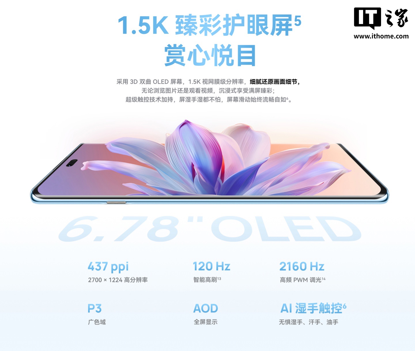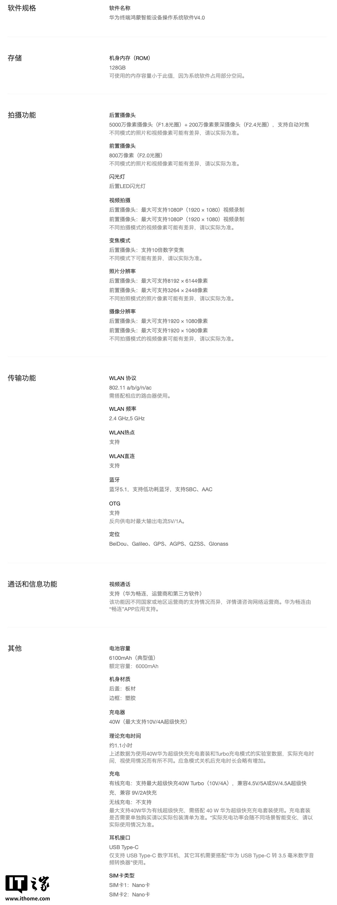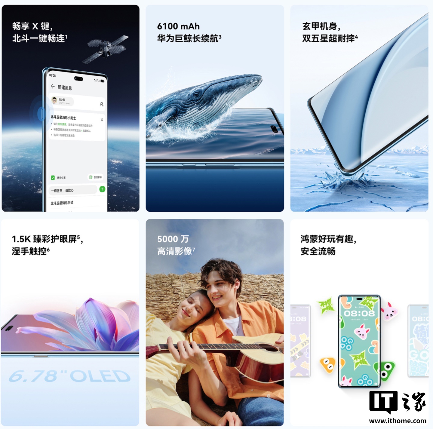华为并未披露该机的 SoC 及 RAM 信息,商品页详情显示该机搭载一块 6.78 英寸 2700×1224 分辨率 120Hz OLED 屏幕,配备 8MP 自拍摄像头;机身背面采用 50MP+2MP 摄像头。机身内置 6100 毫安时电池,支持 40W 充电,手机内置 HarmonyOS 4.2。