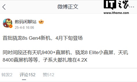 首批高通骁龙 8s Gen4 新机被曝 4 月下旬登场,同期还有天玑 9400+ 直屏机、骁龙 8 Elite 小直屏等