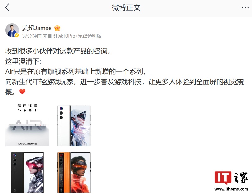 红魔游戏手机产品总经理 @姜超James 今日发文对 10 Air 这款产品进行澄清: