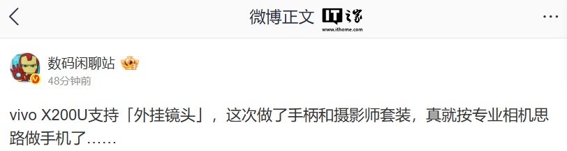 IT之家注意到,博主 @数码闲聊站 今日发文透露,vivo X200 Ultra 手机支持「外挂镜头」。另外他表示“这次做了手柄和摄影师套装,真就按专业相机思路做手机了……”
