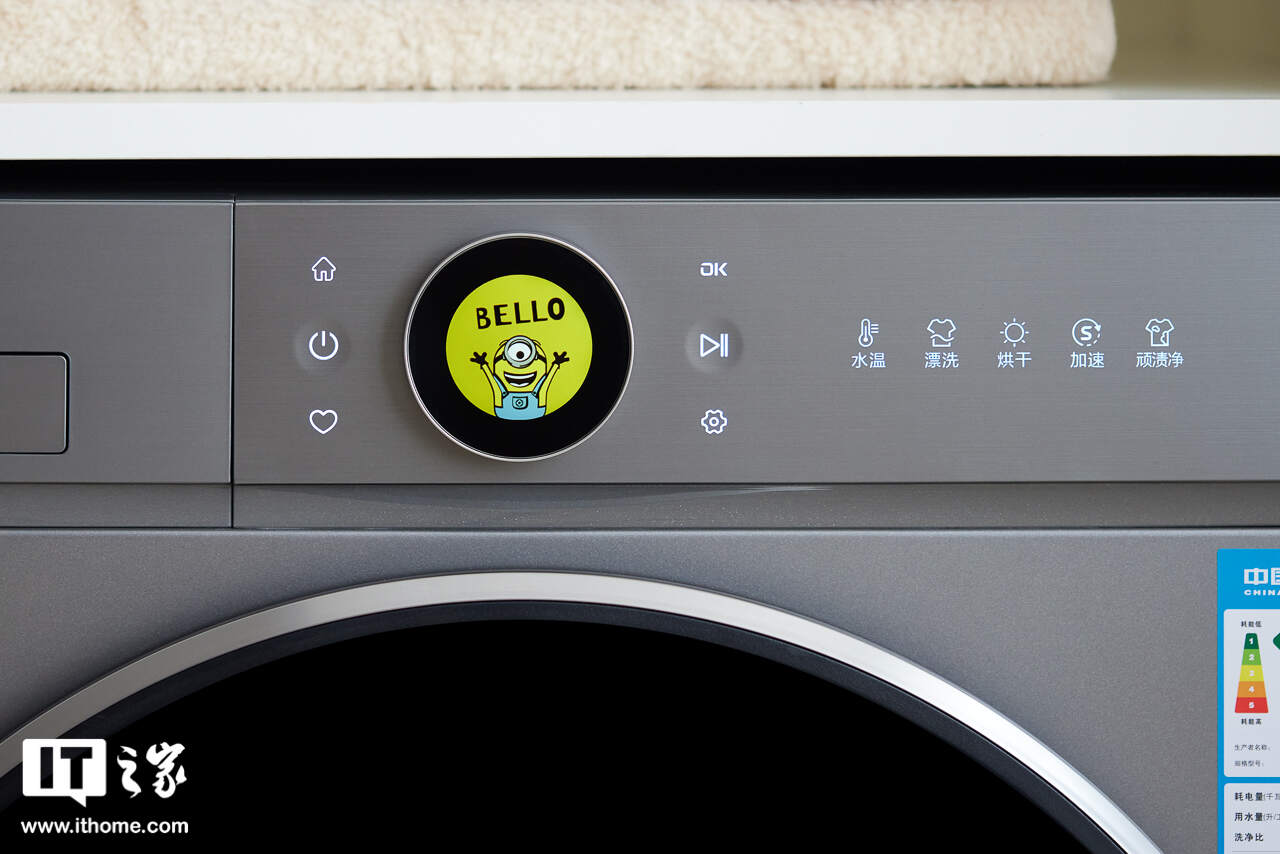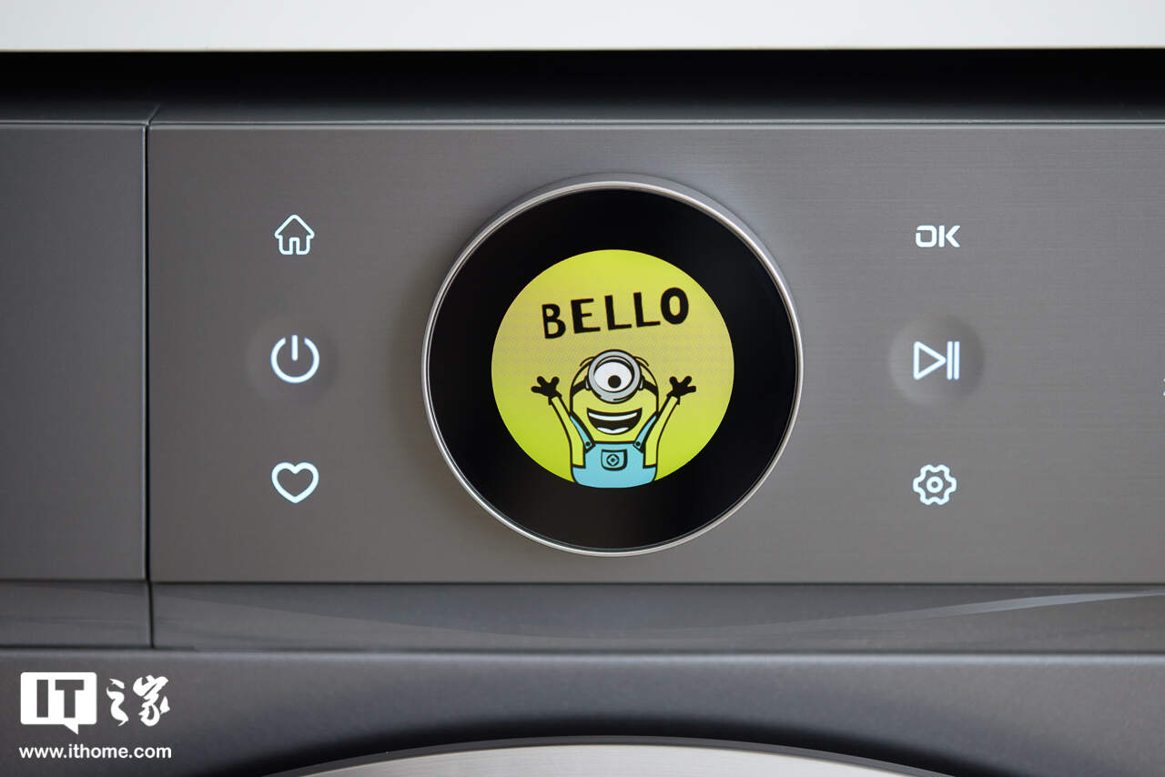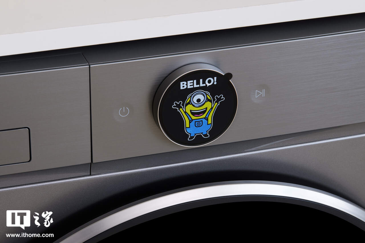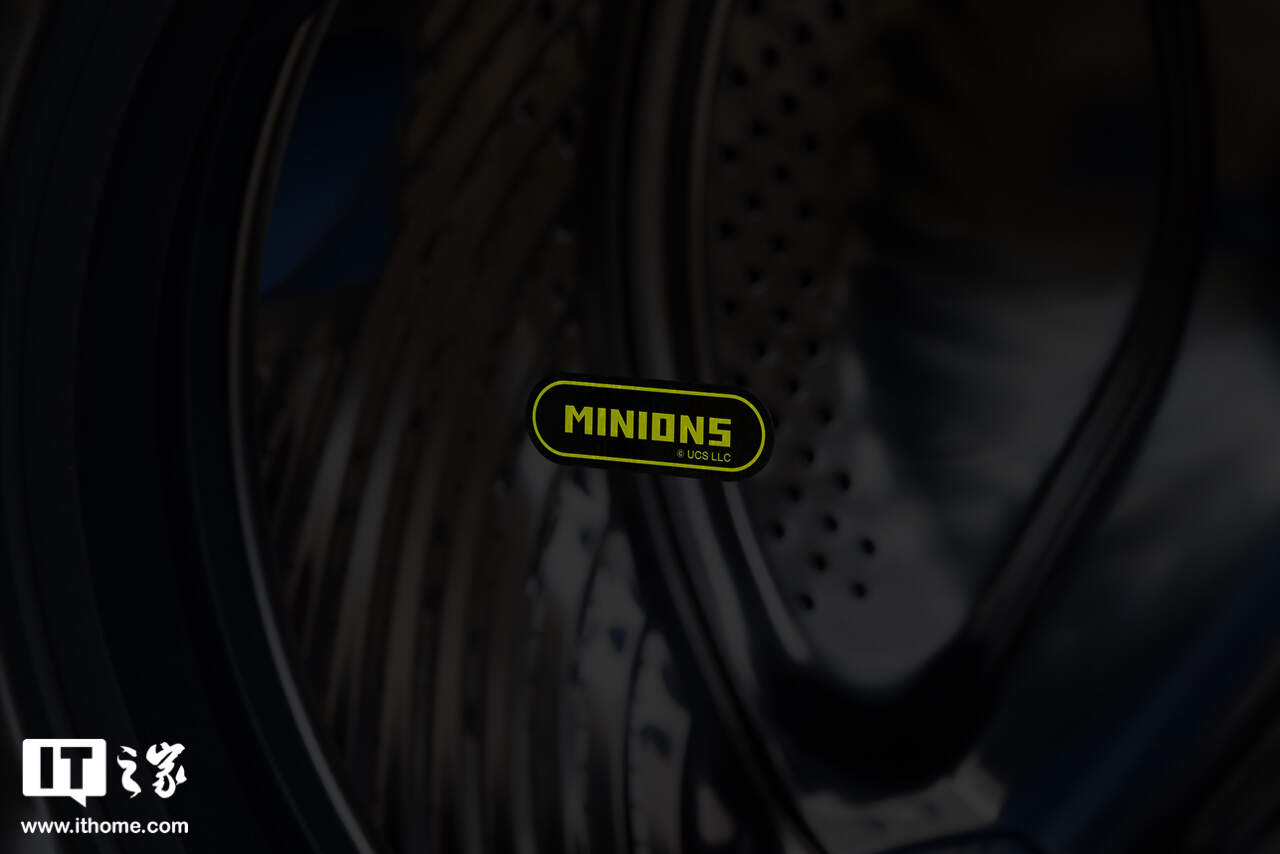 开机时屏幕亮起的 logo 也是可爱的小黄人形象,甚至连滚筒盖中央的 logo 区域,都醒目地印着小黄人的标识。