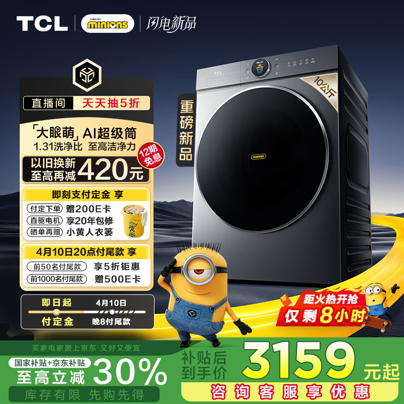 京东 TCL 小黄人 10 公斤大眼萌 AI 超级筒洗烘 1.31 洗净比滚筒洗衣机全自动家电国家补贴以旧换新 G100T7R-HDIS 补贴后 3159 元起直达链接