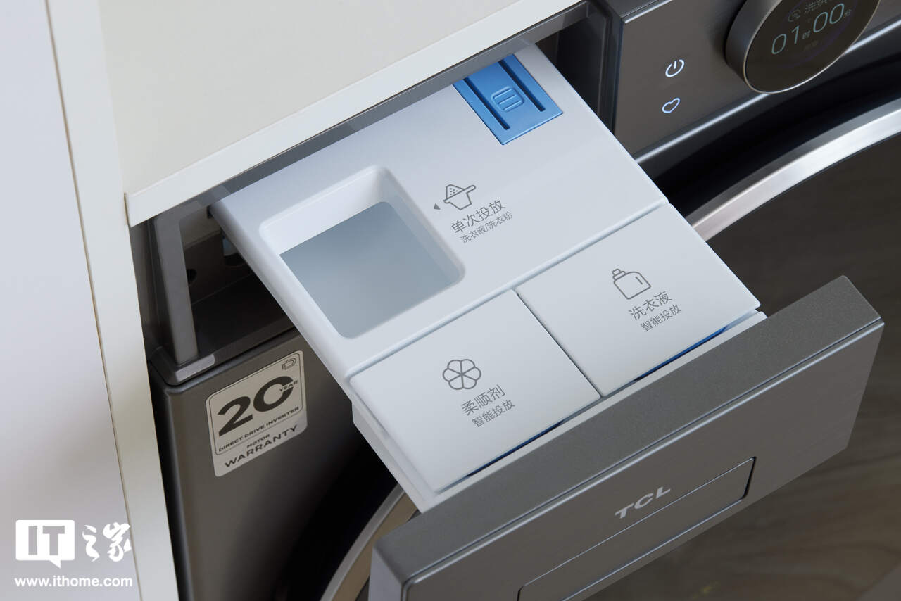 左侧 TCL 的 logo 区域内,隐藏着洗衣液、柔顺剂的投放区,支持智能投放。