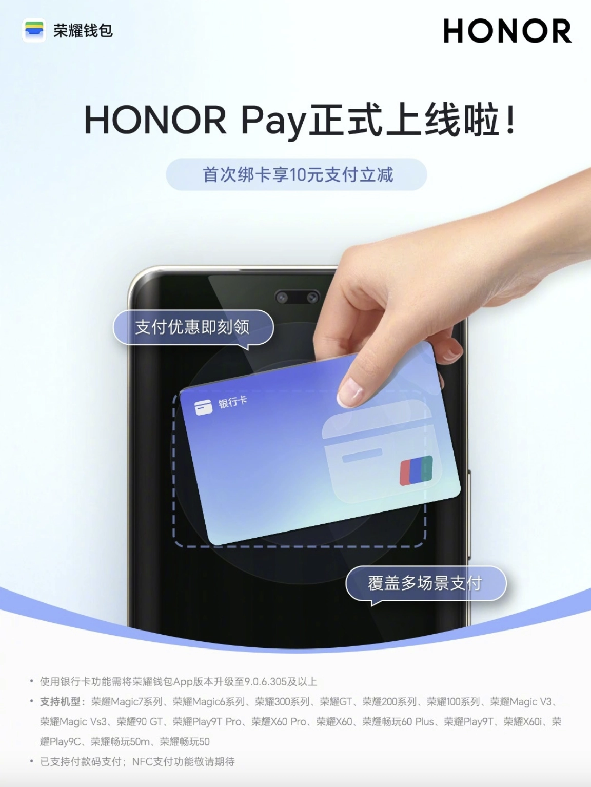 官方表示,首次绑卡可享 10 元支付立减,具体手机方面支持荣耀 Magic6/7 系列、荣耀 100/200/300 系列、荣耀 GT 系列、荣耀 Magic V3 / Vs3、荣耀 90GT、荣耀 Play9T / Pro / 9C、荣耀 X60 / Pro、荣耀畅玩 50/50m / 60 Plus、荣耀 X60i。