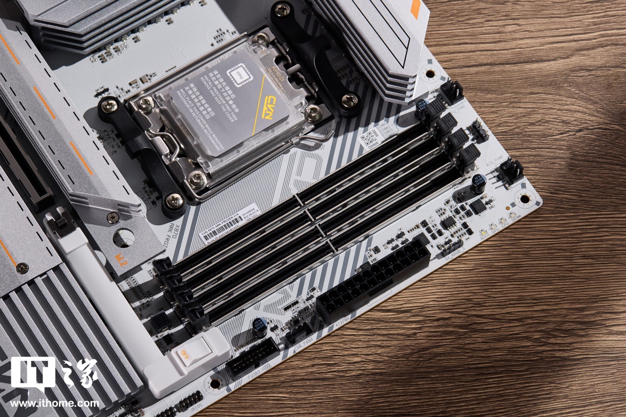 CPU 接口右侧是 4 个黑色 DDR5 内存插槽,插槽周围做了铝合金加固设计,最高支持 8200MHz 的内存频率,单条 48GB 内存容量和最大 192GB 内存容量。内存插槽右侧的主板边缘还集成了 4 颗用于纠错的 LED 灯珠。