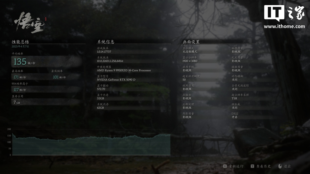 第五款游戏《黑神话:悟空》,以 1080P 分辨率 + 高画质 + 50% 超采样 + TSR,运行游戏自带基准测试,锐龙 9 9950X3D 的游戏平均帧数为 135 帧,1% Low 帧为 101 帧。
