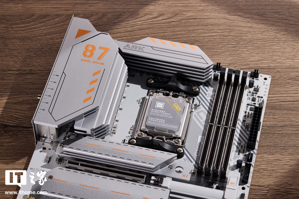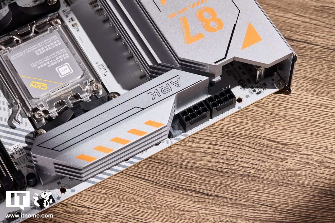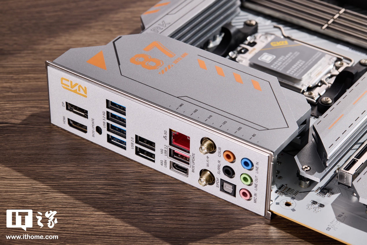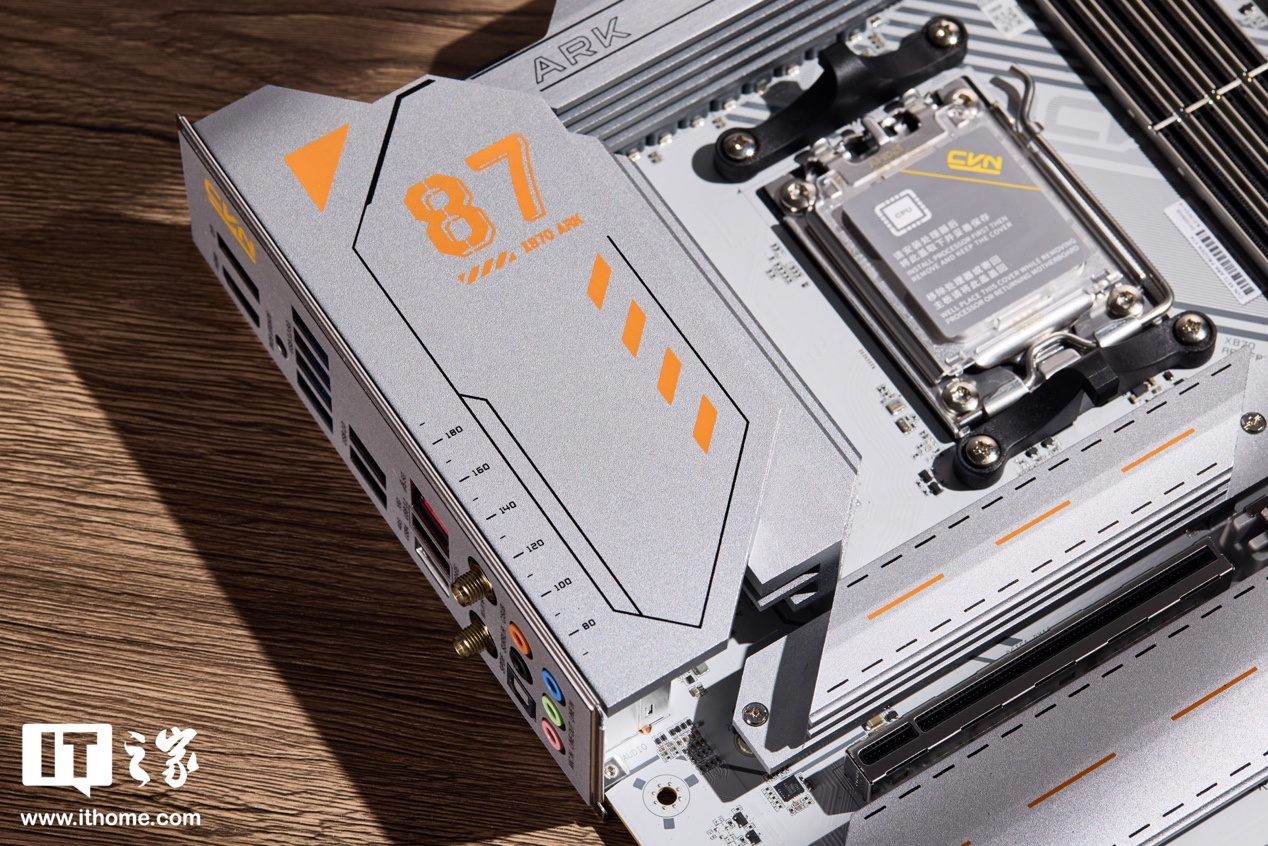 左侧散热装甲上还印有标志性的 87 型号 Logo,加上散落在各处散热装甲上的橙色图案点缀,通过这些视觉元素就能确定主板型号和适用平台。银白作为一个偏中性的颜色,在 DIY 装机中的搭配也较为灵活,浅色和深色硬件都能轻松驾驭。