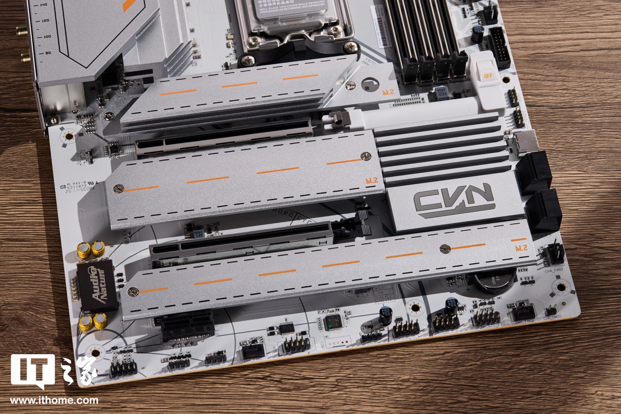 CVN X870 ARK FROZEN V14 方舟主板的下半部分同样做了散热装甲全覆盖,固态硬盘散热装甲全部独立覆盖,第一和第二固态插槽位均为 PCIe5.0 x4 满速率规格,2280 长度;第三固态插槽位则是 PCIe4.0 x4 速率规格,最大支持 22110 长度。