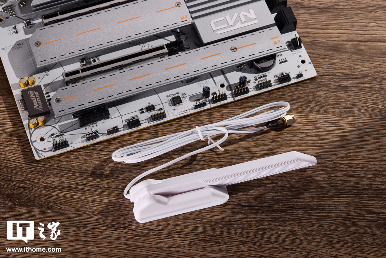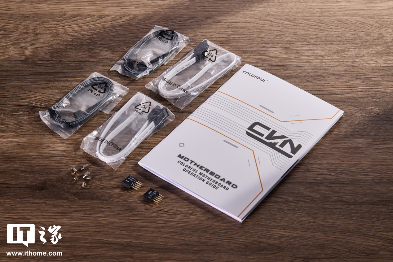 除了主板本体,包装内还附有 Wi-Fi 增强天线、2 根白色 SATA 6GB/s 数据线、1 根 5V ARGB 延长线,1 根 12V RGB 延长线、跳线收纳头、增补螺柱包,还有简易说明手册等。