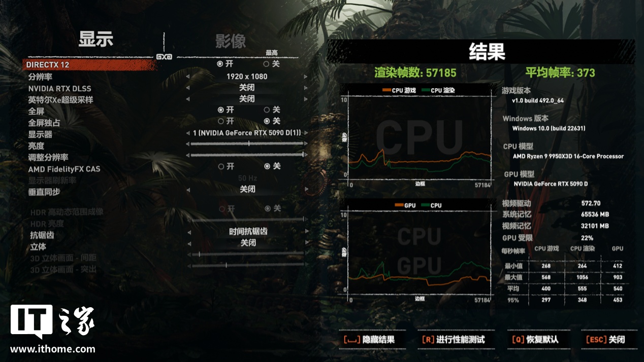 再看单机游戏的表现,第四款游戏《古墓丽影:暗影》,以 1080P 分辨率 + 最高画质,运行游戏自带基准测试:锐龙 9 9950X3D 的游戏平均帧数为 373 帧,1% Low 帧为 280 帧。