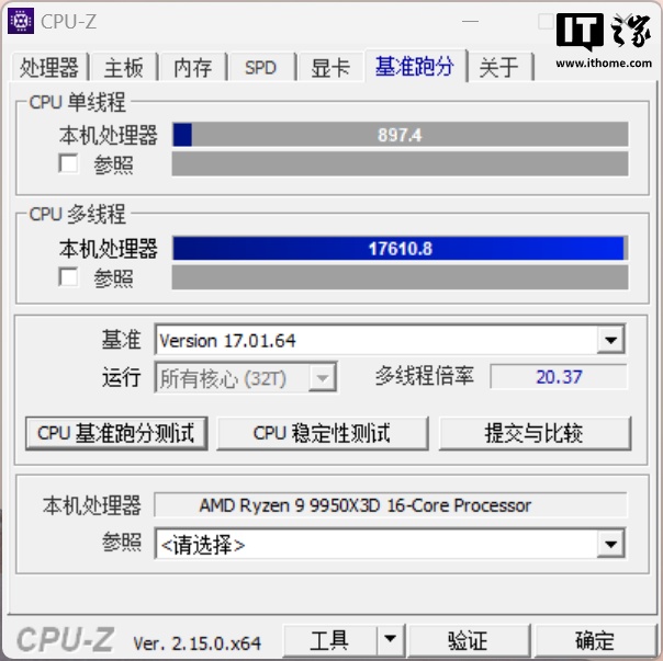 首先是 CPU-Z 的测试,锐龙 9 9950X3D 在该环节中获得了 897 分的单线程分数以及 17610 分的多线程分数。单核成绩逼近 900 分,丝毫不逊于各家顶级 X870 主板的表现,多核成绩表现也很不错。