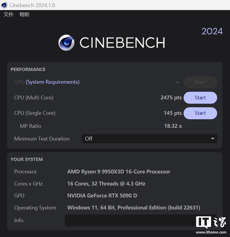 在 CineBench R24 的测试中,锐龙 9 9950X3D 跑到了单核 145 分,多核 2475 分的成绩。其多核成绩领先了锐龙 7 9800X3D 处理器约 76%,看样子我们手上这颗锐龙 9 9950X3D 处理器的体质还是不错的。
