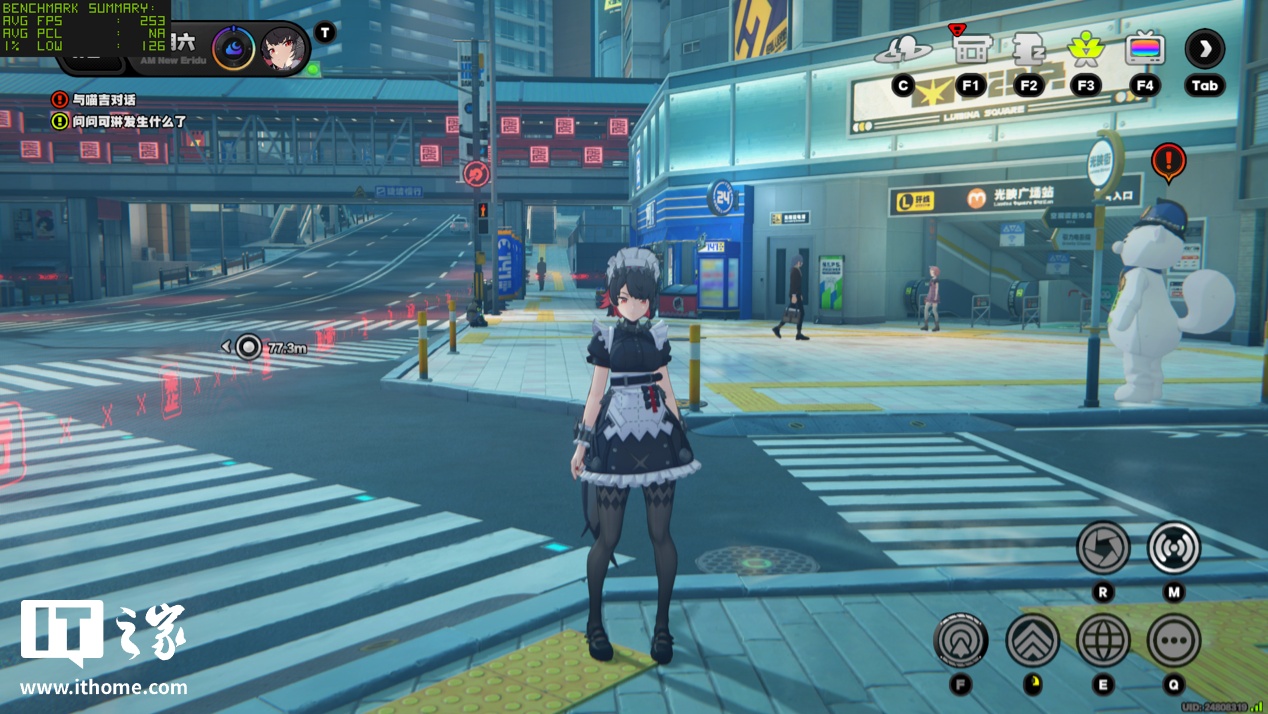 第三款是端游《绝区零》,以 1080P 分辨率 + 高画质 + 1.0 渲染倍率,在光映广场进行 10 分钟跑图,锐龙 9 9950X3D 的游戏平均帧数为 253 帧,1% Low 帧为 126 帧。