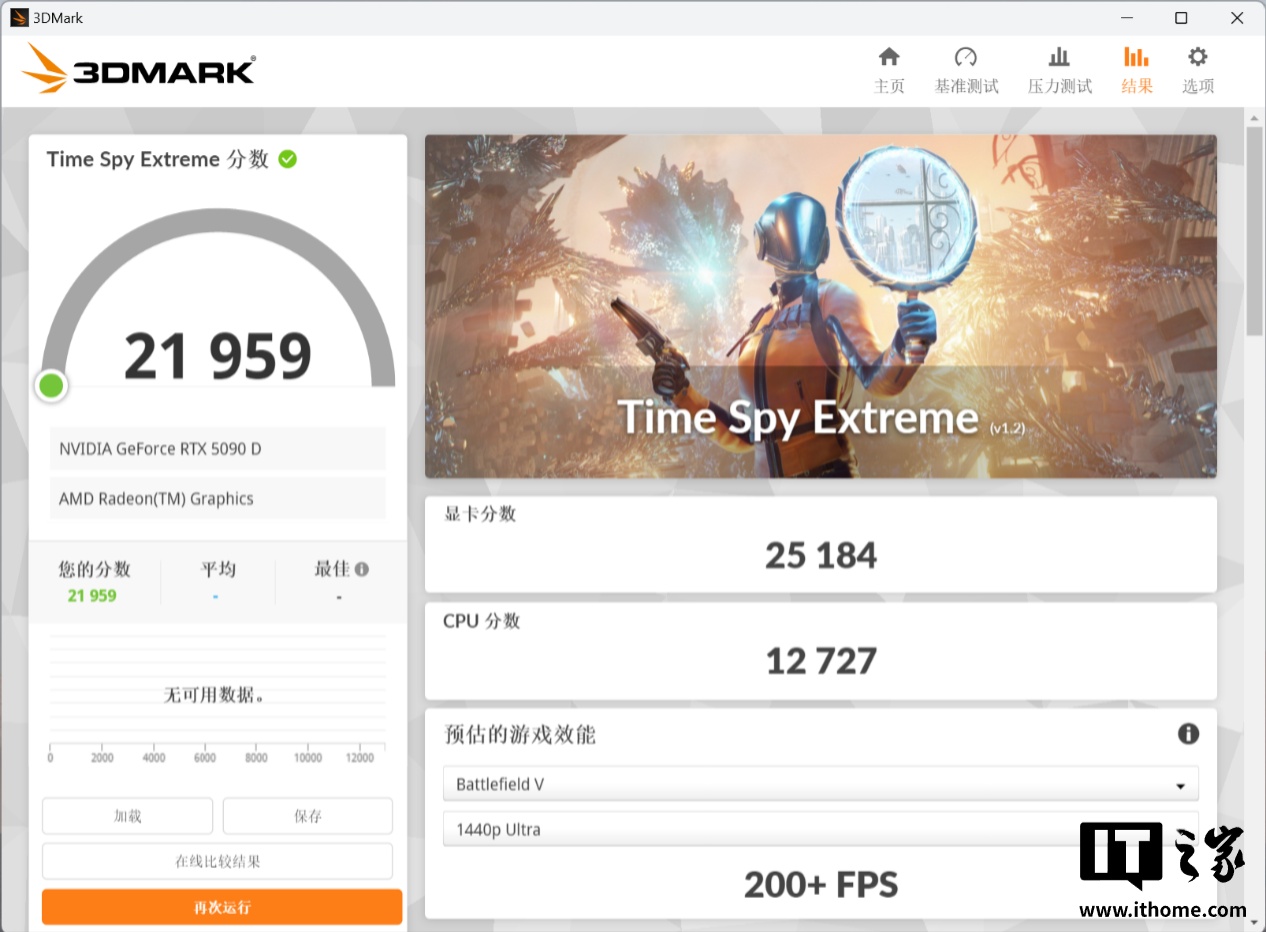 在 3D Mark Time Spy 跑分测试中,锐龙 9 9950X3D 的 CPU 分数为 12727 分,领先锐龙 7 9800X3D 约 105%。