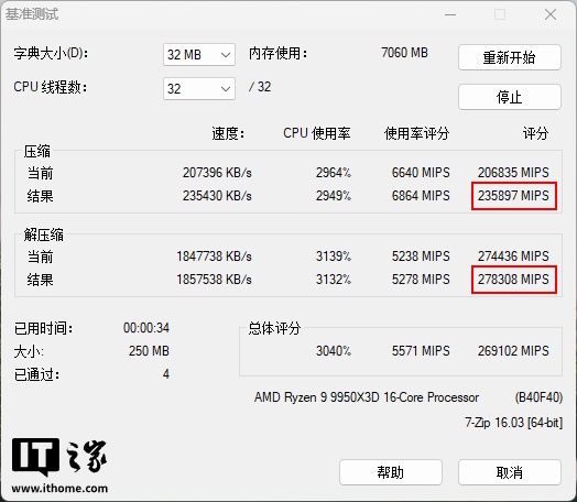 首先是代表文件解压 / 压缩性能的 7-Zip 基准测试,锐龙 9 9950X3D 压缩项目评分为 235 GIPS,锐龙 7 9800X3D 压缩项目评分为 278 GIPS。